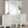 Framing the vanity dresser and mirror is a decorative beveled mirror accent.  Alligator embossing and high polished crystal-enhanced hardware boldly accent the white finish.