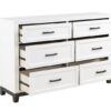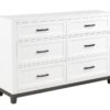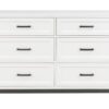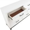 The distinct grain features a 2-tone finish. Metal bar hardware accents the picture frame drawer fronts of the dresser
