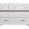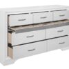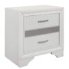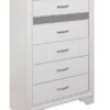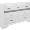The jewelry drawers feature felt lining to protect your hidden items from wear and tear. The panel headboard features acrylic silver glitter accent banding as well as a silver faux leather channel-padded insert. Polished chrome bar drawer pulls front of the drawers proving complementing contrast to the collections finish.